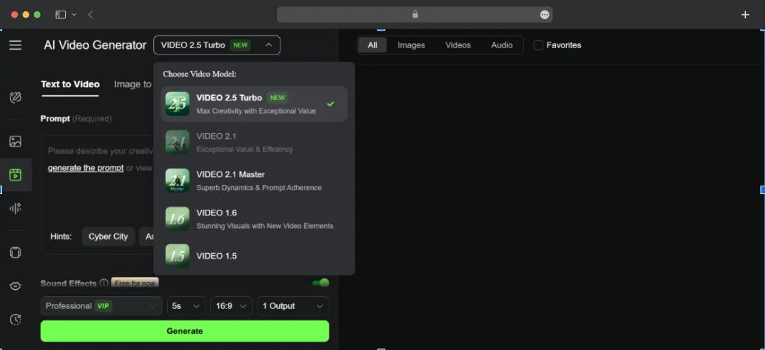 Step 2: Select Your Generation Model: Choose the AI model that best fits your project's needs. kling AI offers several options with different strengths, such as Video 2.5 Turbo for faster generation or Video 2.1 Master for higher detail and realism.