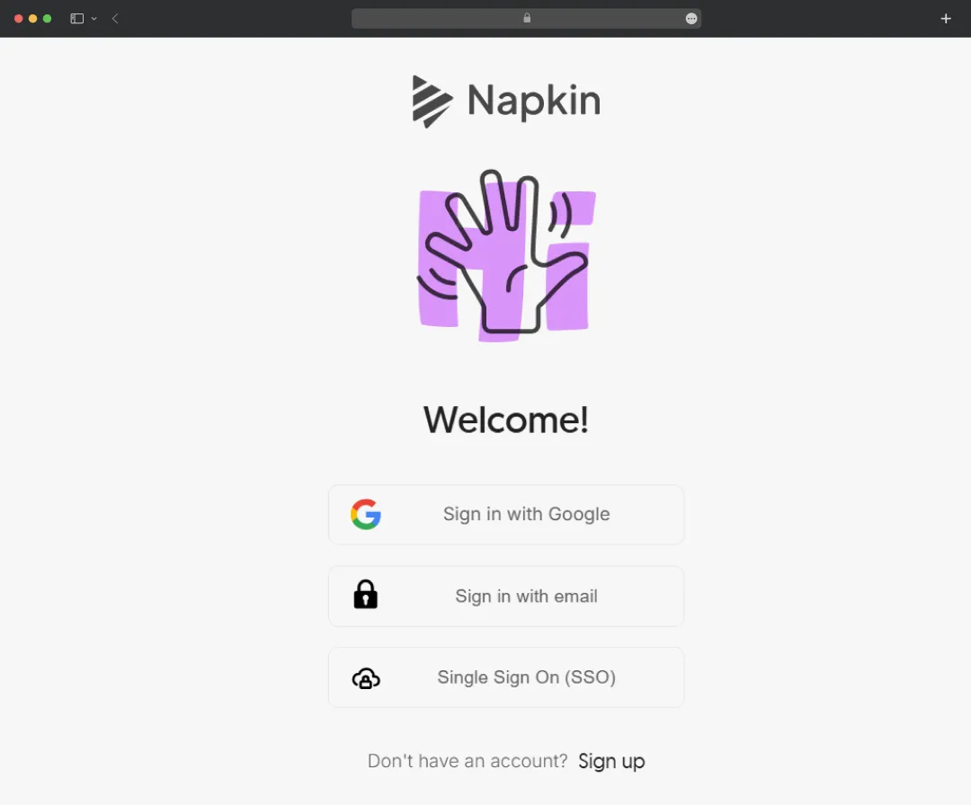 Account creation is only available on desktop computers (not on mobile devices). Head to Napkin AI website - https://app.napkin.ai and you'll have two sign-up options: