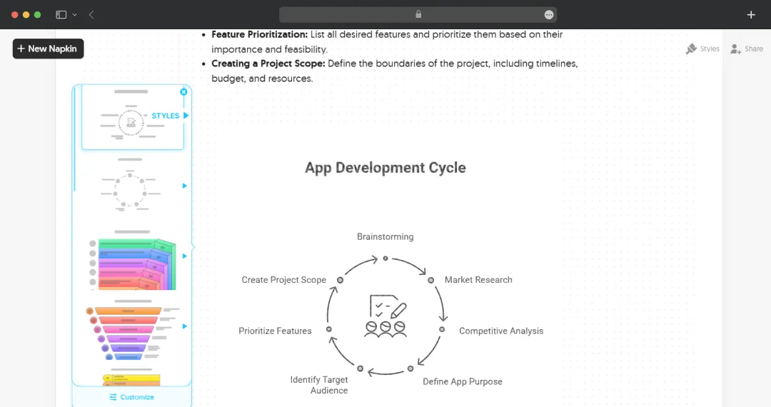 Currently, Napkin AI doesn't offer the option to manually select a specific visual type, but the AI is designed to understand context and produce visuals that align with your content's intent Medium. To help Napkin AI generate a visual closer to your preference, try adding a descriptive hint at the start of your text—for example, if you want a chart, begin with "Chart:" or "Graph showing..." Medium. This small cue guides the AI toward the style you're aiming for without requiring complex prompts.