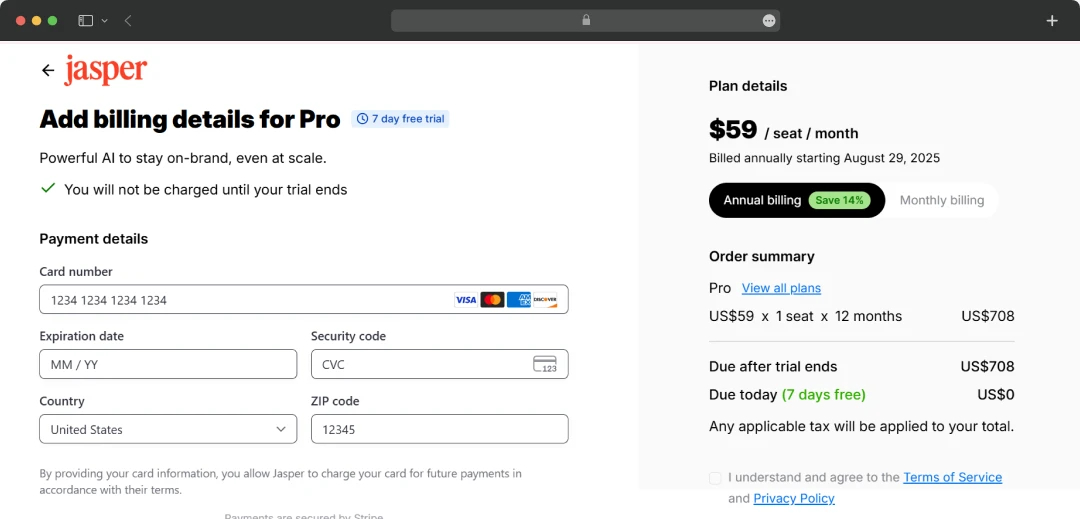 Jasper accepts major credit cards, debit cards for annual subscriptions, and invoice-based billing for qualified business accounts. Monthly billing occurs on the same date as the original subscription with automatic renewal, while annual billing provides immediate access to full benefits.