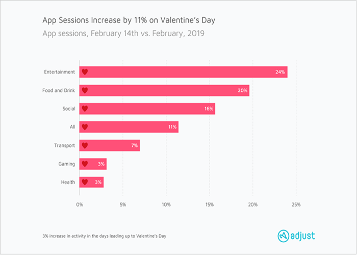 In fact, a recent study by Adjust indicates an increase of 11% in in-app activity on Valentine’s Day, compared to the rest of the month. The eye-opening insights into app usage and habits are compiled by examining app data grouped by vertical.