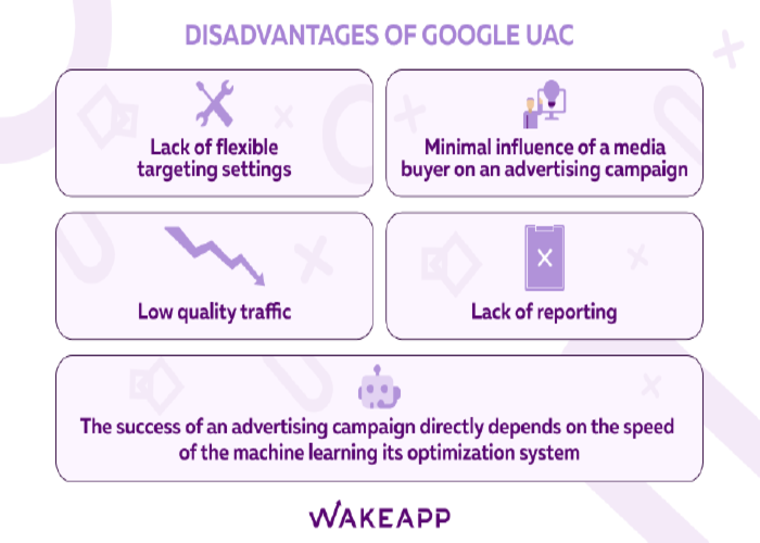 It takes time to set up a machine algorithm for optimizing advertising campaigns. Google UAC lacks the ability to set up flexible targeting. Therefore, it takes some time for the program to identify the target audience for a specific application by testing creatives and headlines, which slows down the entire promotion process.