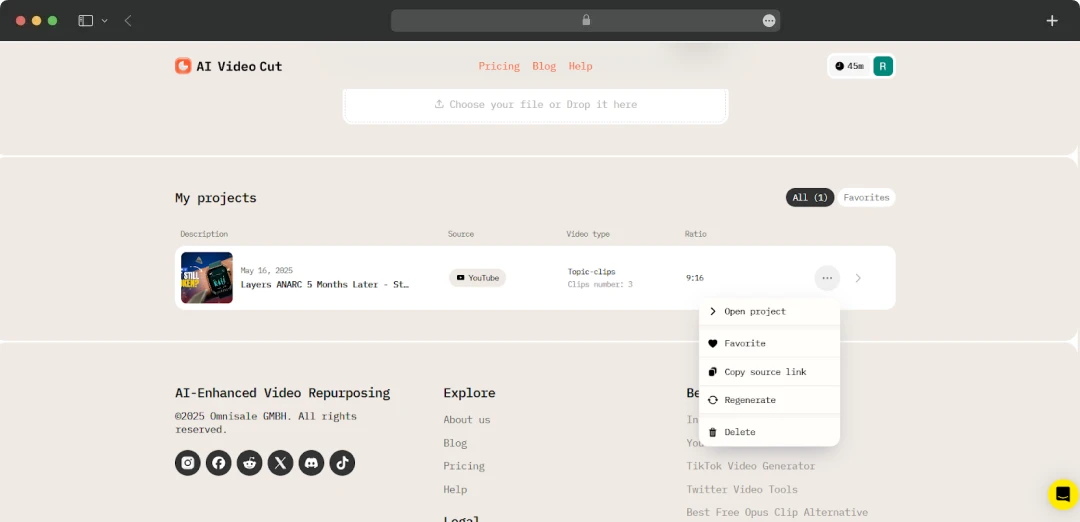 By clicking on the three, you can favorite your clips, ask the tool to regenerate, or copy the source link directly.
