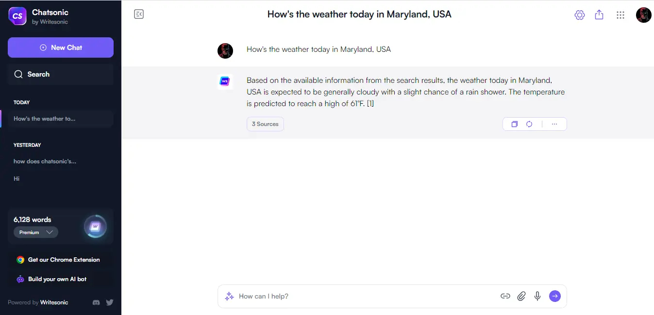 5. Upon asking the question, “How's the weather today in Maryland, USA”, ChatSonic instantly surfed Google and gave me the latest information it could find.