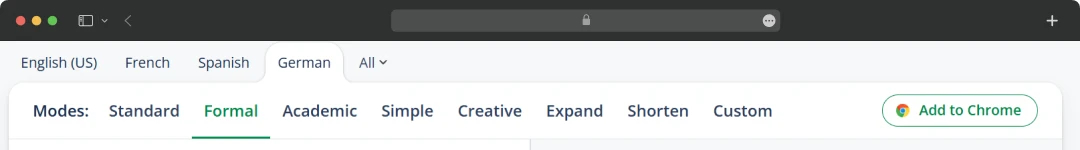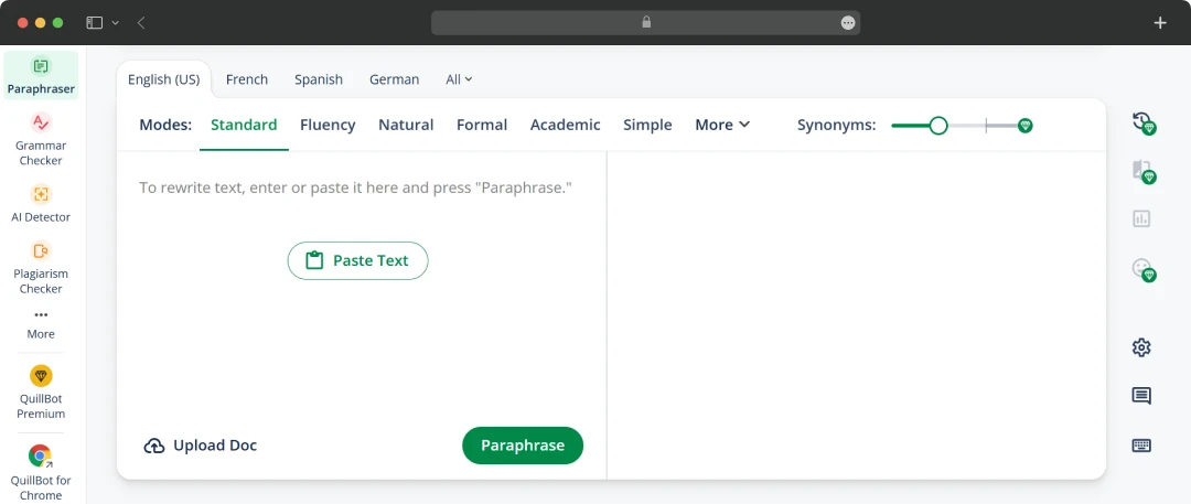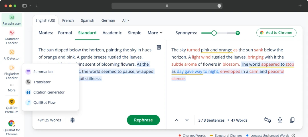 QuillBot delivers the capability to adjust the tone of the content generated with multiple options. For example, formal, academic, simple, creative, etc. Simply by clicking on each of these settings and clicking on “Rephrase,” the tool will produce the desired outcome.